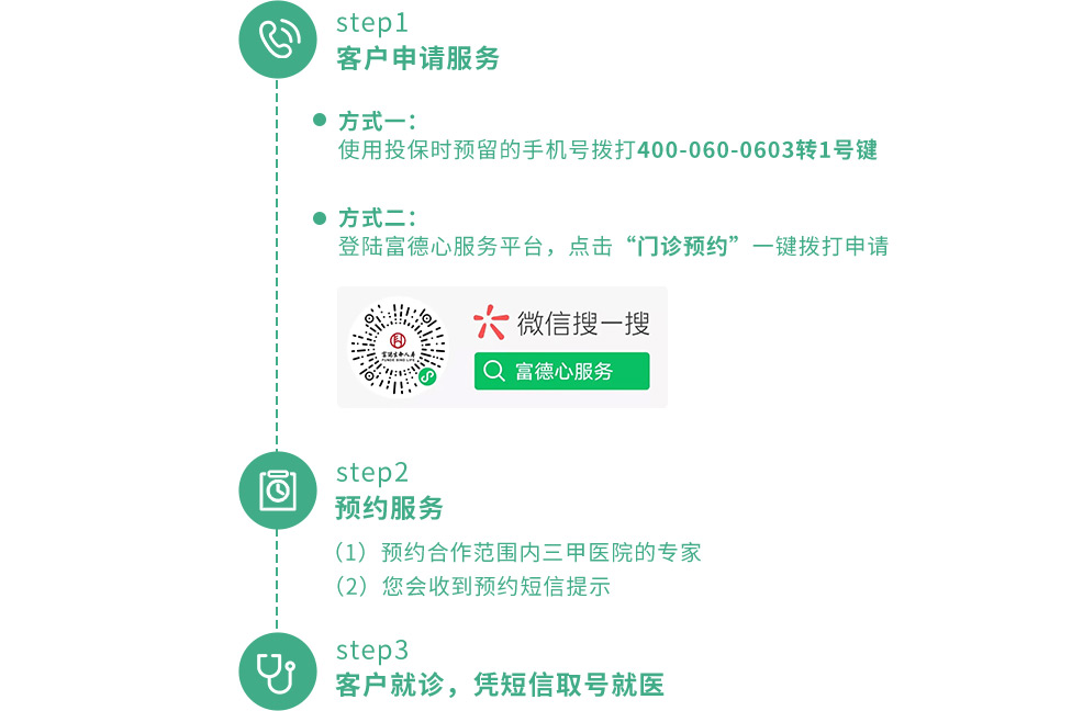 特定健康險(xiǎn)有效保單客戶可使用投保時(shí)預(yù)留的手機(jī)號撥打服務(wù)熱線,400-060-0603轉(zhuǎn)1號鍵?;虻顷懜坏滦姆?wù)平臺,點(diǎn)擊“門診預(yù)約”同樣可以一鍵撥打申請。健康管家將根據(jù)客戶的病情、地址及醫(yī)院資源情況幫客戶預(yù)約合作范圍內(nèi)三甲醫(yī)院的專家,預(yù)約成功后將發(fā)送預(yù)約短信至客戶,客戶憑短信即可到醫(yī)院取號就醫(yī)。